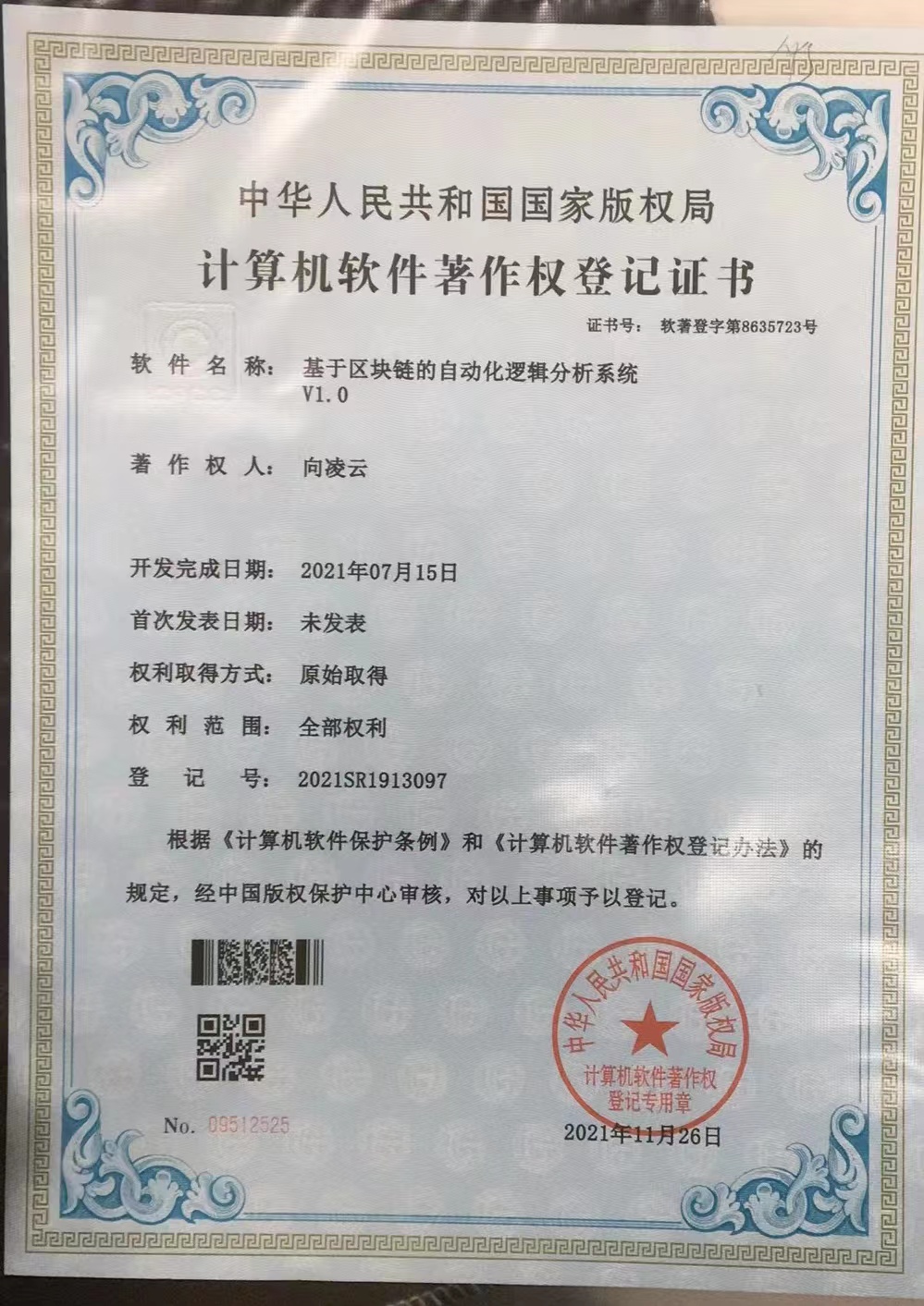 向凌云教授在人工智能、区块链与智能系统领域持续深耕,主导开发多项具有自主知识产权的计算机软件,并获得中华人民共和国国家版权局正式登记授权。相关软件成果涵盖智能逻辑分析、数据资产管理、区块链应用等核心领域,是其理论研究与工程实践深度融合的重要体现,为推动数字经济与智能产业发展提供了坚实的技术支撑。